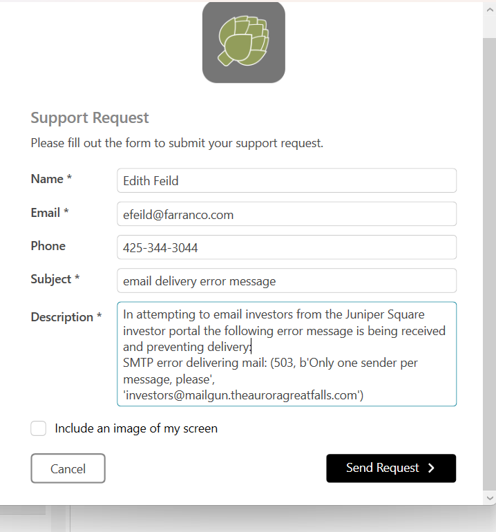 I'm not sure what that is about. I'll text Peet. I'm traveling to Great Falls right now. Sent from my Verizon, Samsung Galaxy smartphone Get[Outlook for Android](https://aka.ms/AAb9ysg) --------------------------------------------------------------- From: Edee Feild <[email protected]> Sent: Wednesday, February 25, 2026 11:02:58 AM To: Liz Scaggs <[email protected]> Cc: Artichoke Support - Peet <[email protected]> Subject: FW: Email delivery error summary Hi Liz, I sent in a support request to Peet but am hoping you might know how to fix this email issue. I used the same process as always and this is the first time that this has failed. I was attempting to email all Olivet investors through the Juniper Square portal, but the email is failing due to the following issue: When we [Juniper Square] attempted to deliver an email you recently sent entitled “Olivet Housing, LLC (Aurora Apartment Homes) Q4 2025 Quarterly Report”, we received an error message from your email provider: SMTP error delivering mail: (503, b'Only one sender per message, please', '[email protected]') [embedded image] From: [email protected] <[email protected]> Sent: Wednesday, February 25, 2026 9:43 AM To: Edee Feild <[email protected]> Subject: Email delivery error summary Dear Edee, When we attempted to deliver an email you recently sent entitled “Olivet Housing, LLC (Aurora Apartment Homes) Q4 2025 Quarterly Report”, we received errors from your email provider for some of the recipients. Overall, we were able to deliver 0 of the messages, but we received errors for the other 26. You can [view this email on Juniper Square](https://theauroragreatfalls.junipersquare.com/email_batch/2103516) for a full list of the results and the errors we received. Please contact us if you have any questions; you may also wish to contact your email service provider to investigate the source of the issue if it is not readily apparent. Best, The Juniper Square Team [email protected] Juniper Square, Inc. ∙ 555 Montgomery, Suite 1400, San Francisco, CA 94111