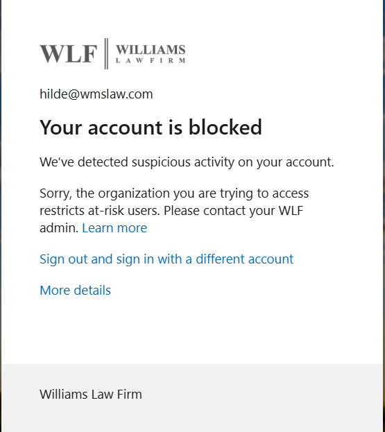 Hilde, Not a pest at all! I'm sorry I was sidtracked with other WLF issues. This one is a bit silly, but I understand. back in 2023 Nick's account had a risky behavior flagged, in mid 2025 your account was flagged risky. I reviewd both when they happened, and both were non-issues. I'd never encountered a functional reason to clear the alert until now. I've cleared both your accounts, and you should be good. But i'm currious if Nick was able to access the data yesterday or before 10AM today. If he could, but you couldn't that doesn't make much sense unless their "Risky User" block is only for "risky users" that have risk signals in the previous 12months or so. Thanks.Peet